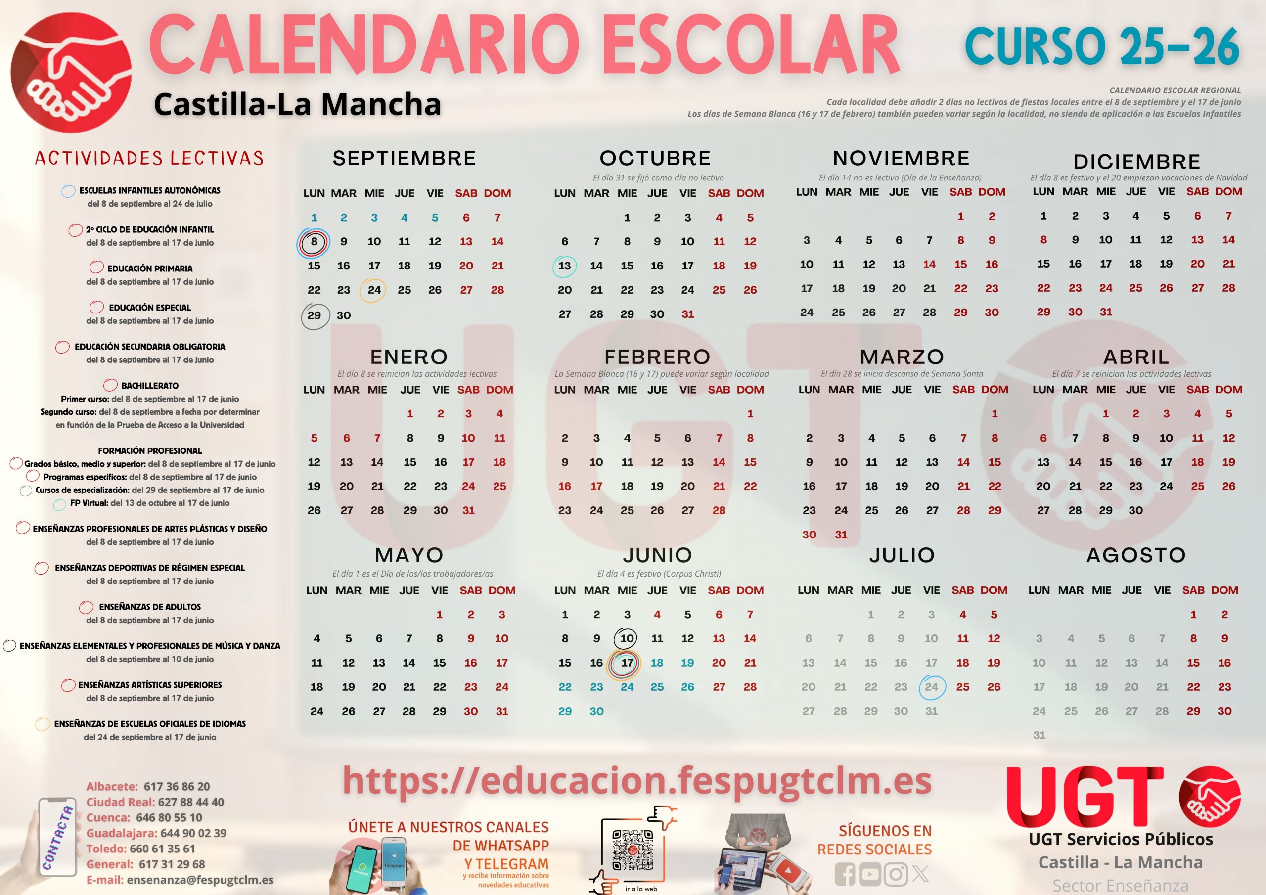 https://educacion.fespugtclm.es/storage/Calendario-escolar-regional-25-26-UGT-1024x724.jpghttps://educacion.fespugtclm.es/storage/Calendario-escolar-regional-25-26-UGT-150x150.jpgUGT EnseñanzaCalendario EscolarSlidecalendario castilla-la mancha,calendario escolarDías lectivos Escuelas Infantiles Autonómicas: del 8 de septiembre al 24 de julio 2º Ciclo de Infantil, Primaria, Educación Especial, ESO, 1º de Bachillerato, FP Grado Básico, FP Grado Medio, FP Grado Superior, Programas Específicos de FP, Enseñanzas Profesionales de Artes Plásticas y Diseño y Enseñanzas Deportivas de Régimen...Sector Enseñanza de UGT Servicios Públicos Castilla-La Macha