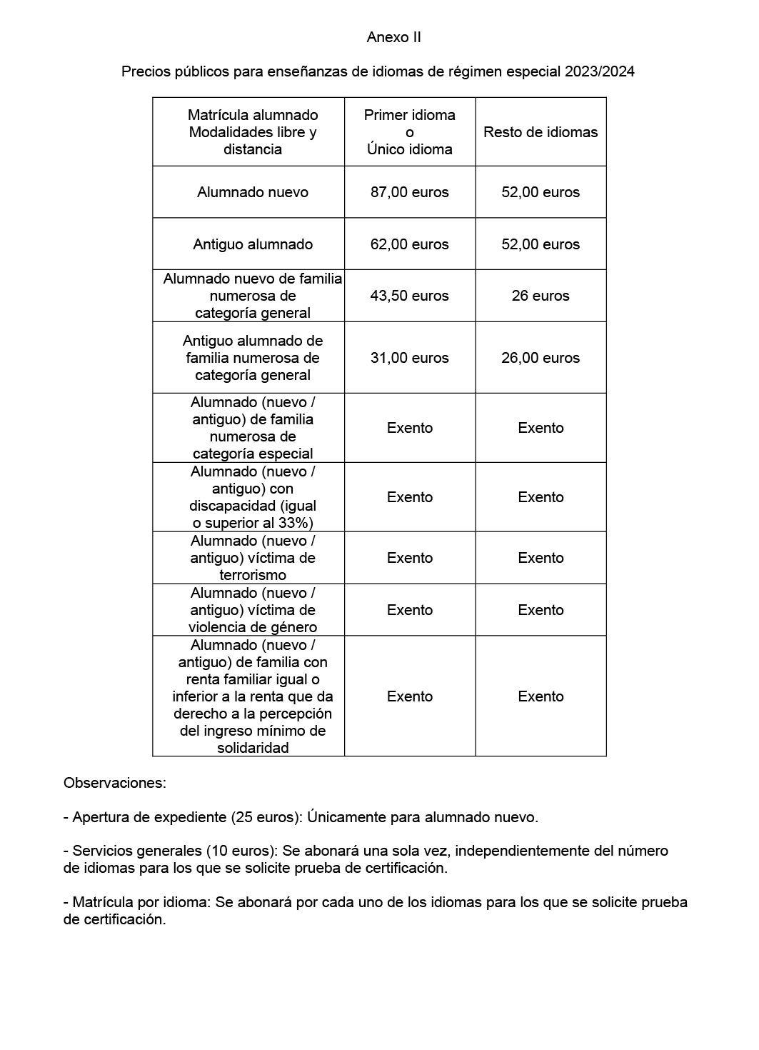Las personas solicitantes que sean miembros de familia numerosa de categoría general tendrán una bonificación del cincuenta por ciento, mientras que aquellos miembros de familia numerosa de categoría especial estarán exentos de pago. Estarán exentas de pago las personas que presenten un grado de discapacidad igual o superior al 33% y el alumnado que haya sido víctima de actos terroristas o sea hijo o hija o cónyuge no separado legalmente de fallecidos o heridos en actos terroristas, así como quienes acrediten ser víctimas de violencia de género, y sus hijos e hijas. También estarán exentas las personas pertenecientes a familias con renta familiar igual o inferior a la renta que da derecho a la percepción del ingreso mínimo de solidaridad.