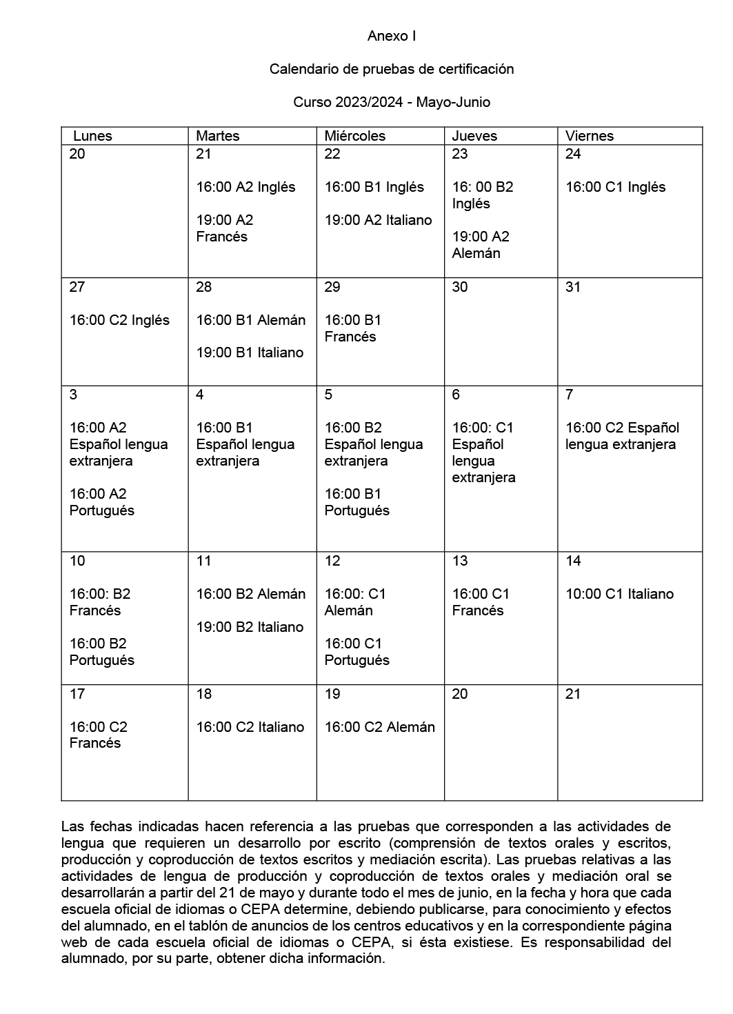 Las pruebas se realizarán en las escuelas oficiales de idiomas y en los centros autorizados y podrán realizarse en días festivos.