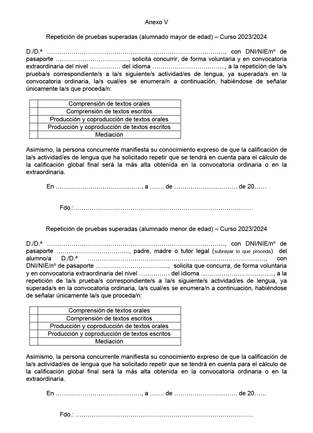- Si está matriculado en un curso no conducente a certificación y solicite participar en las pruebas de certificación del mismo idioma en el que esté matriculado. En este caso, deberá anular su matrícula de la modalidad presencial en un plazo de cinco días hábiles a partir del día siguiente al de la publicación del listado provisional. De no hacerlo, se considerará que renuncia al cambio a la modalidad libre.