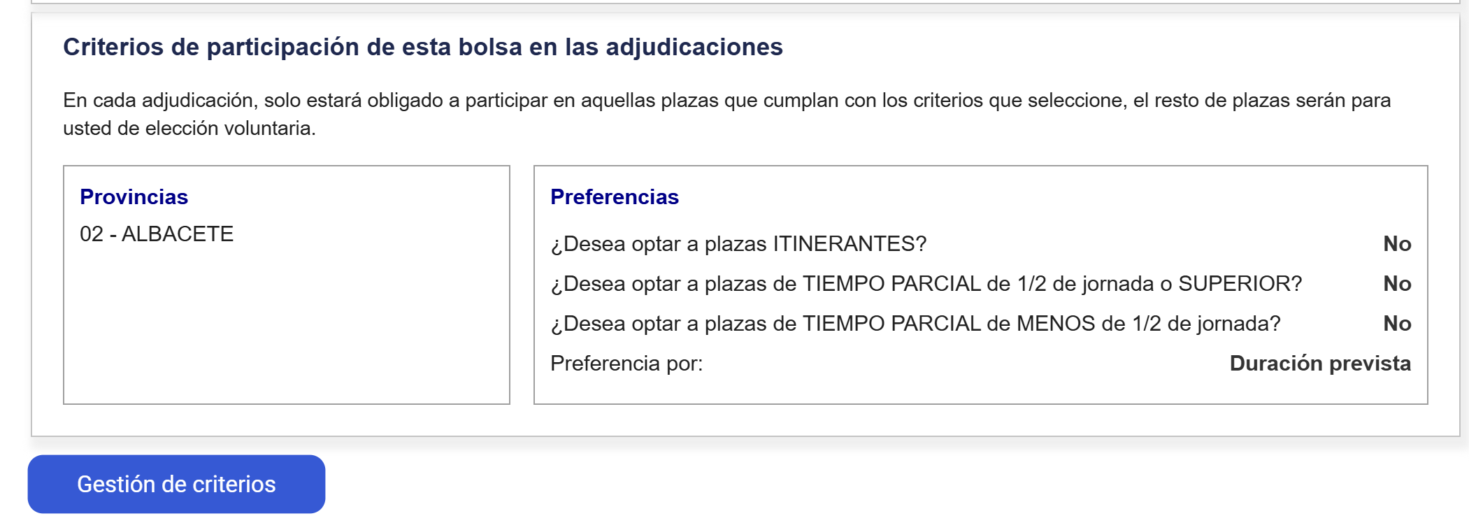 - Si tu prioridad es trabajar dónde sea, puedes valorar poner unos criterios lo más amplios posibles (por ejemplo, marcando las 5 provincias, las jornadas parciales, etc). Podrás hacer también adjudicaciones a la carta, y ordenar tus peticiones, pero si una semana no hicieras petición y estuvieras disponible, tendrías más opciones de ser adjudicado/a.