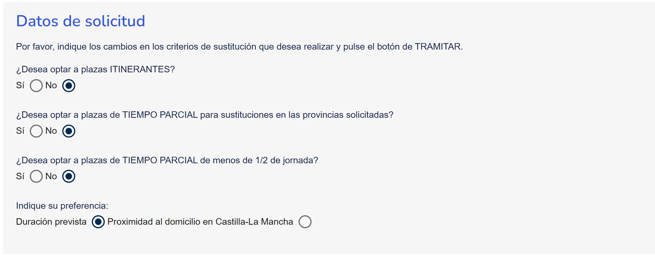 - Itinerancias: se puede marcar si se desea poder ser adjudicado/a o no en plazas itinerantes.