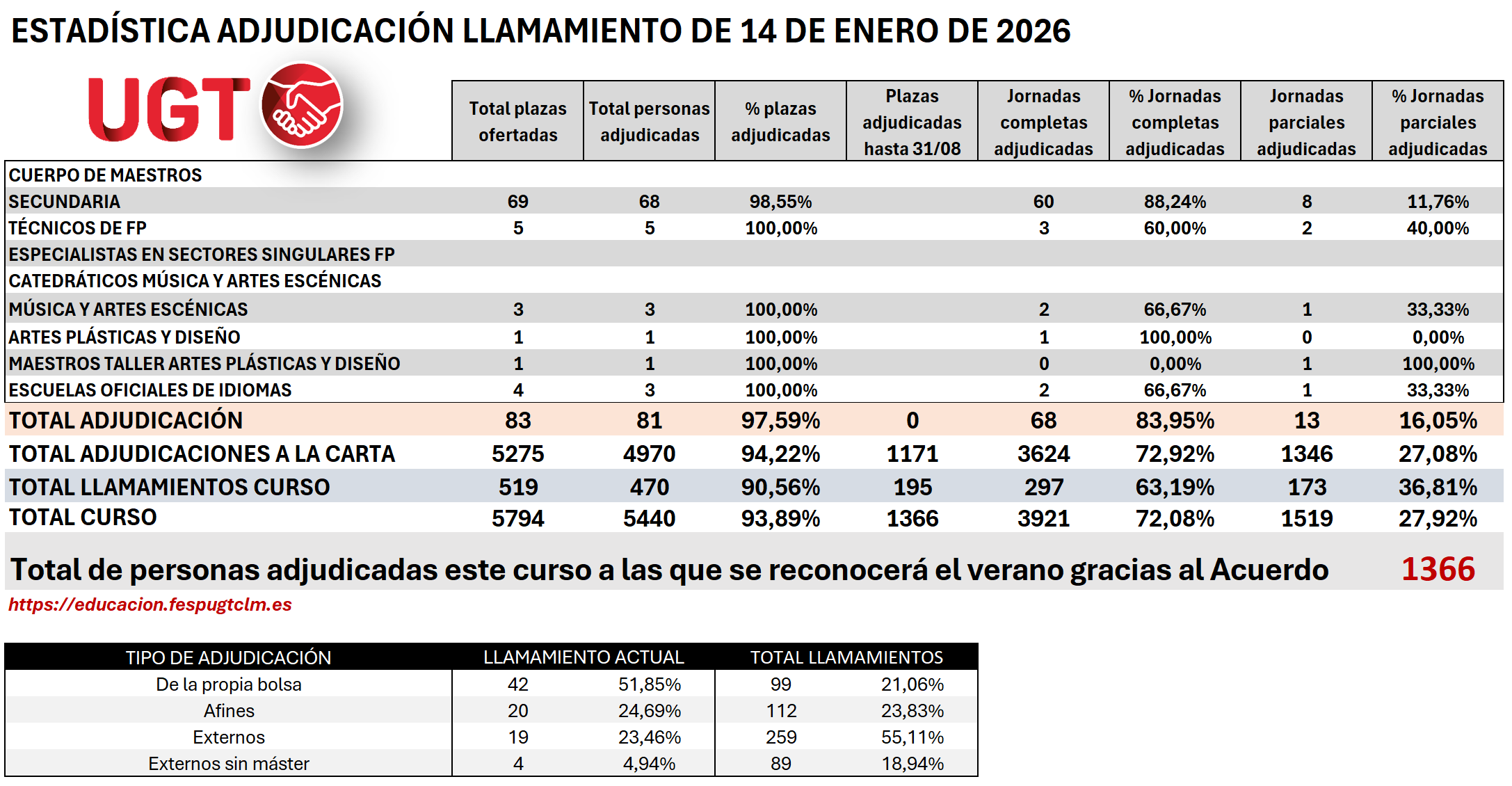 https://educacion.fespugtclm.es/storage/Captura-de-pantalla-2025-09-10-125231.pnghttps://educacion.fespugtclm.es/storage/Captura-de-pantalla-2025-09-10-125231-150x150.pngUGT EnseñanzaLlamamientos telemáticosSlideÚLTIMAS NOTICIAS: E. PÚBLICA      Adjudicación del llamamiento Ver aquí personas adjudicadas 22 Convocatoria Resolución: ver aquí Especialidades convocadas Secundaria (0590): Economía. Filosofía. Francés. Griego. Hostelería y turismo, bilingüe inglés (C1). Informática. Instalaciones electrotécnicas. Latín. Lengua castellana y literatura. Matemáticas. Música. Organización y procesos de mantenimiento de vehículos. Organización y proyectos de fabricación mecánica. Procedimientos de diagnóstico clínico y...Sector Enseñanza de UGT Servicios Públicos Castilla-La Macha