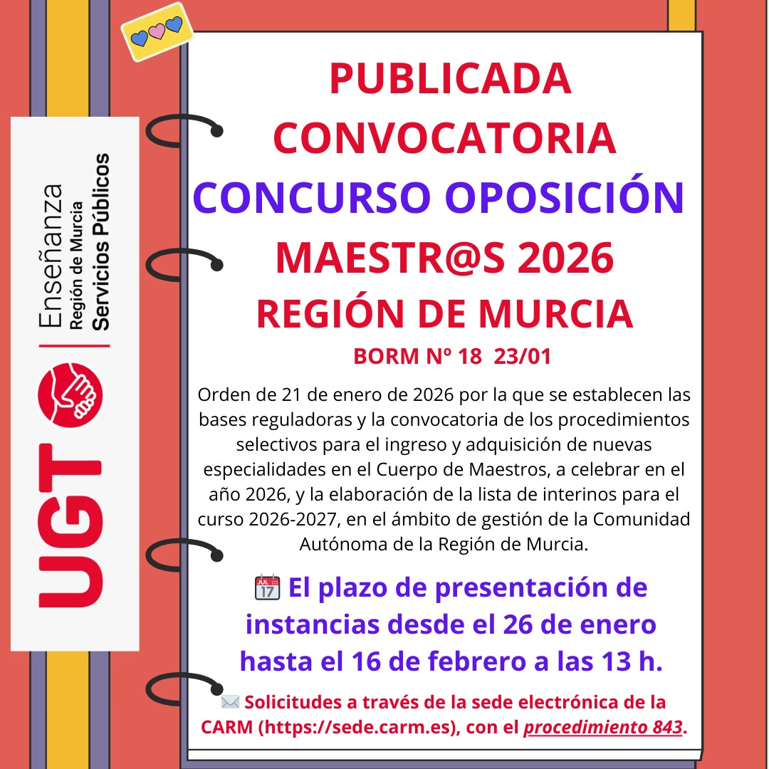 MURCIA: Convocadas 1607 plazas para las oposiciones 2026 del cuerpo de Maestros (solicitudes del 26 de enero al 13 de febrero)