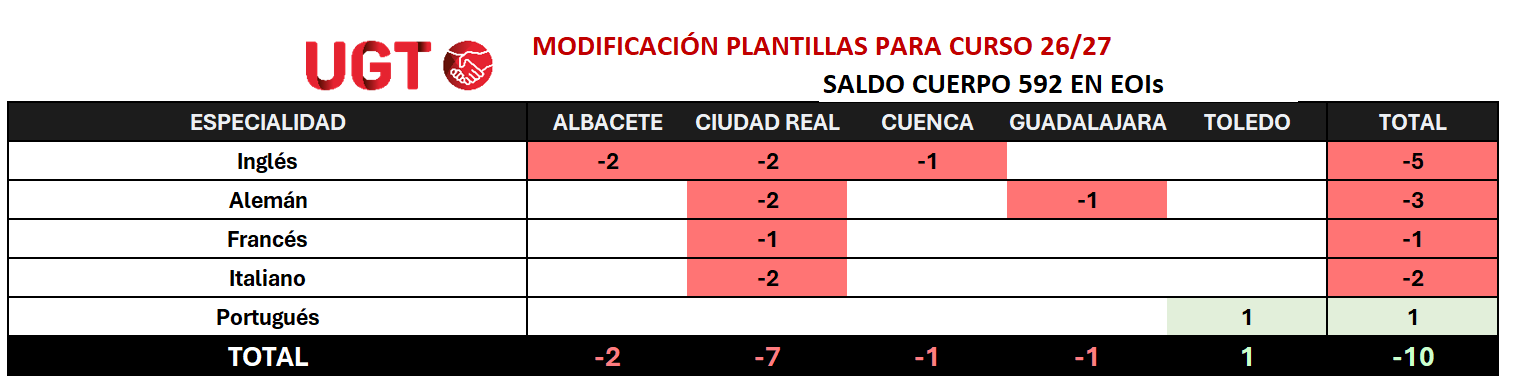 https://educacion.fespugtclm.es/storage/Captura-de-pantalla-2026-01-19-220336.pnghttps://educacion.fespugtclm.es/storage/Captura-de-pantalla-2026-01-19-220336-150x150.pngUGT EnseñanzaSlideÚLTIMAS NOTICIAS: E. PÚBLICAPara el curso que viene, podrían desaparecer casi el 8% de las plazas actuales de las plantillas orgánicas en estos centros. La destrucción en la última década sería así de casi un 25% de la plantilla, siendo más notable en las provincias de Albacete y Ciudad Real, donde supera...Sector Enseñanza de UGT Servicios Públicos Castilla-La Macha