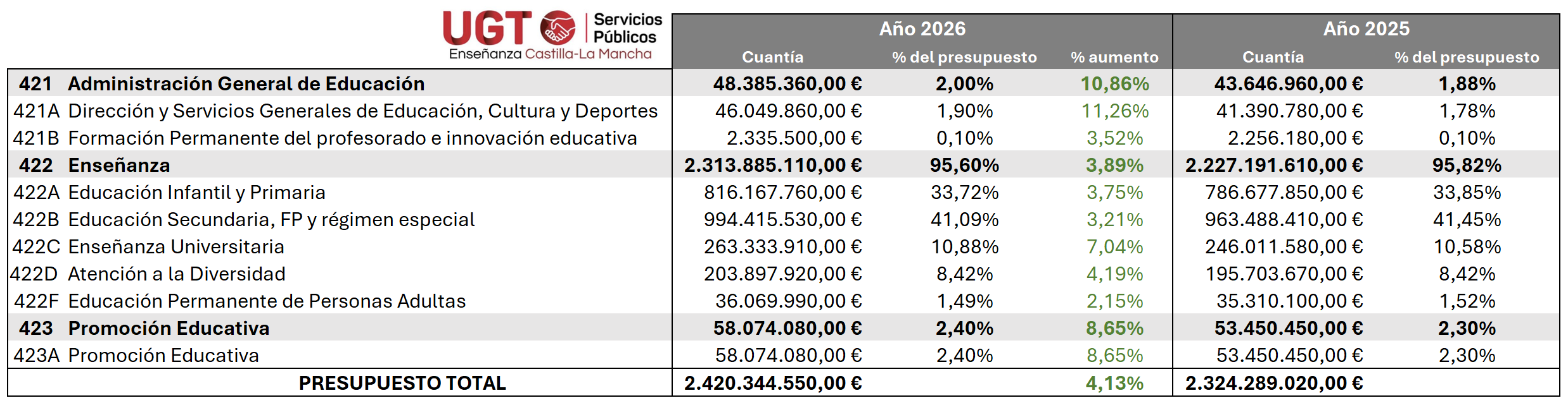 Publicada en el DOCM la Ley 5/2025, de 19 de diciembre, de Presupuestos Generales de la Junta de Comunidades de Castilla-La Mancha para 2026. En dicha Ley se recoge, en comparación con la Ley de Presupuestos para el año 2025, un aumento de en torno al 4% en materia de Educación. En la siguiente tabla puedes ver una comparativa con la Ley anterior.