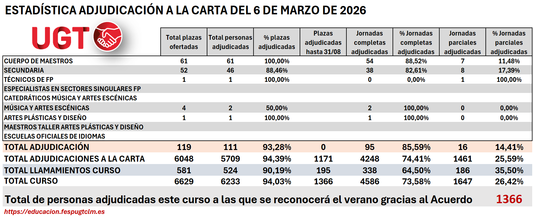 https://educacion.fespugtclm.es/storage/Captura-de-pantalla-2024-07-21-211328.pnghttps://educacion.fespugtclm.es/storage/Captura-de-pantalla-2024-07-21-211328-150x150.pngUGT EnseñanzaAdjudicaciones centralizadasINTERINOSÚLTIMAS NOTICIAS: E. PÚBLICA_novedades centrosPróxima adjudicación el próximo viernes Durante la semana podrá haber adjudicaciones telefónicas Últimas adjudicaciones previas a las vacaciones de Semana Santa: 📌 Adjudicaciones a la carta: 20 de marzo 📌 Oferta telemática: 11 de marzo ¡¡UGT reclama transparencia en las adjudicaciones telefónicas!! ¿DUDAS?: Contacta en ugtensenanzaclm@gmail.com Resultado de la adjudicación Esta adjudicación se ha realizado con la...Sector Enseñanza de UGT Servicios Públicos Castilla-La Macha