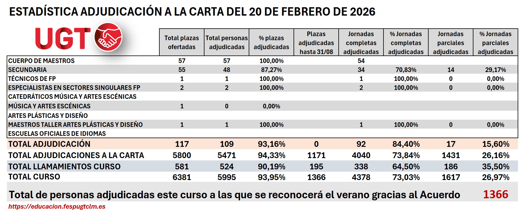 Adjudicación de sustituciones del 20/02/26 con el sistema “a la carta” conseguido con el Acuerdo de Mejoras
