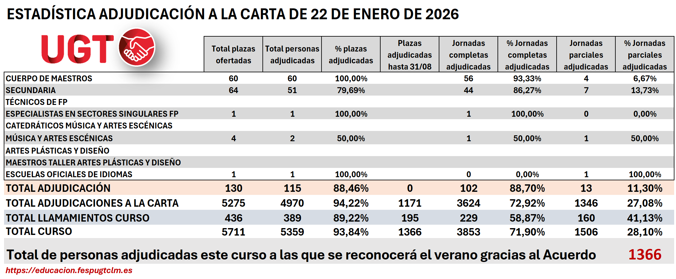 Esta adjudicación se ha realizado con la nueva plataforma, gracias al Acuerdo de Mejoras firmado por UGT. El resultado de la adjudicación se podrá ver también en el seguimiento personalizado del nuevo sistema de adjudicación.