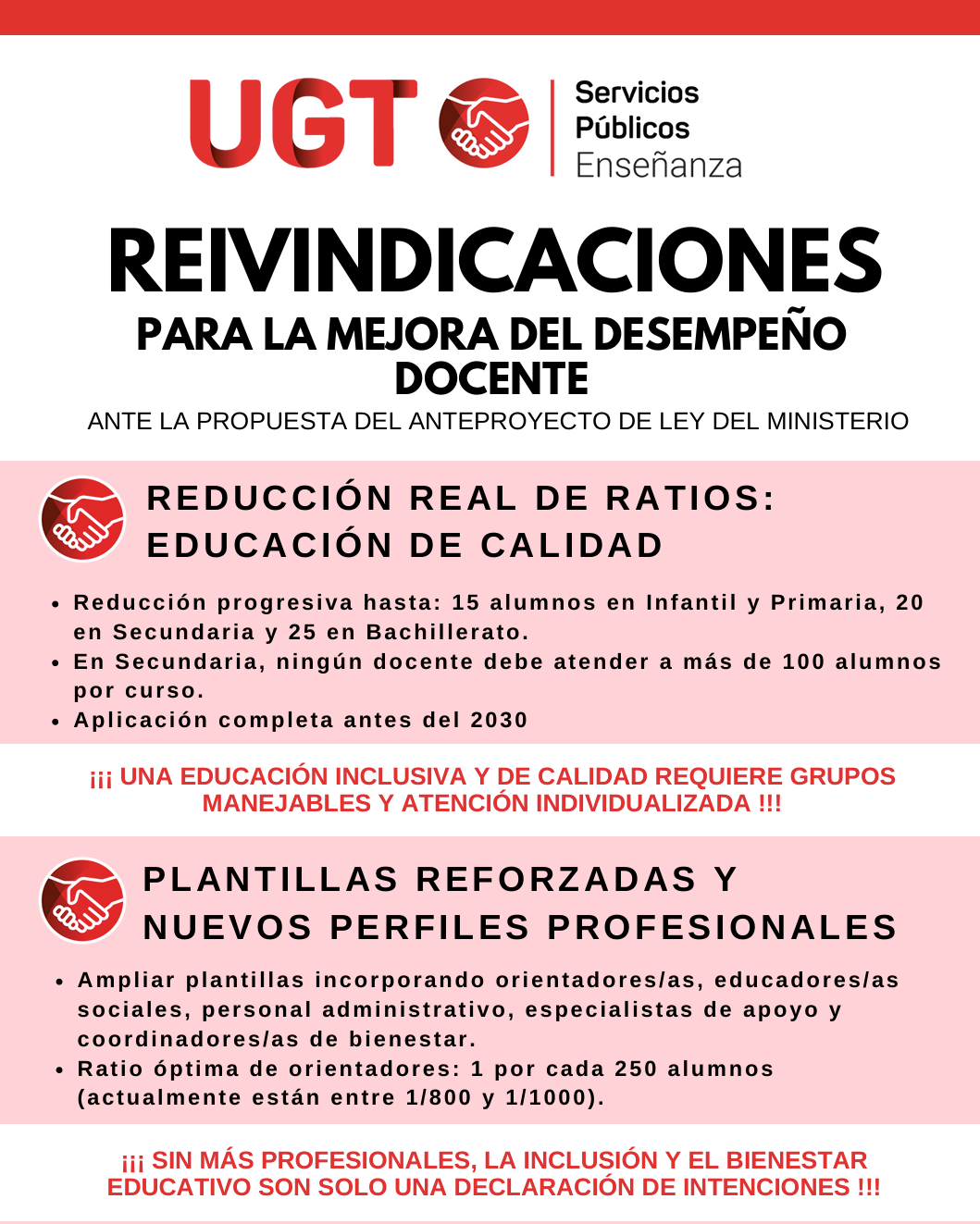 En conclusión, el Sector de Enseñanza de UGT Servicios Públicos, considera imprescindible que el texto final del anteproyecto garantice avances reales y urgentes, con recursos humanos suficientes, financiación adecuada y un calendario más corto, para que las medidas tengan efectos inmediatos en las aulas y en las condiciones laborales del profesorado.