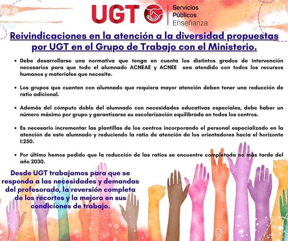 - Jornada lectiva: UGT rechaza que se mantenga la posibilidad de ampliar excepcionalmente las horas lectivas en Secundaria hasta 20 horas semanales y exige que no se supere en ningún caso el máximo de 18 horas, para garantizar una mejora real de las condiciones laborales.