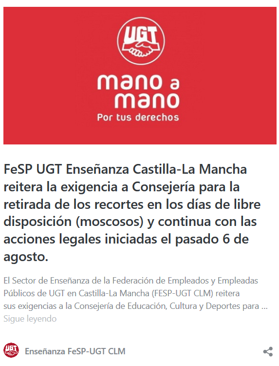 FeSP UGT Enseñanza Castilla-La Mancha reitera la exigencia a Consejería para la retirada de los recortes en los días de libre disposición (moscosos) y continua con las acciones legales iniciadas el 6 de agosto
